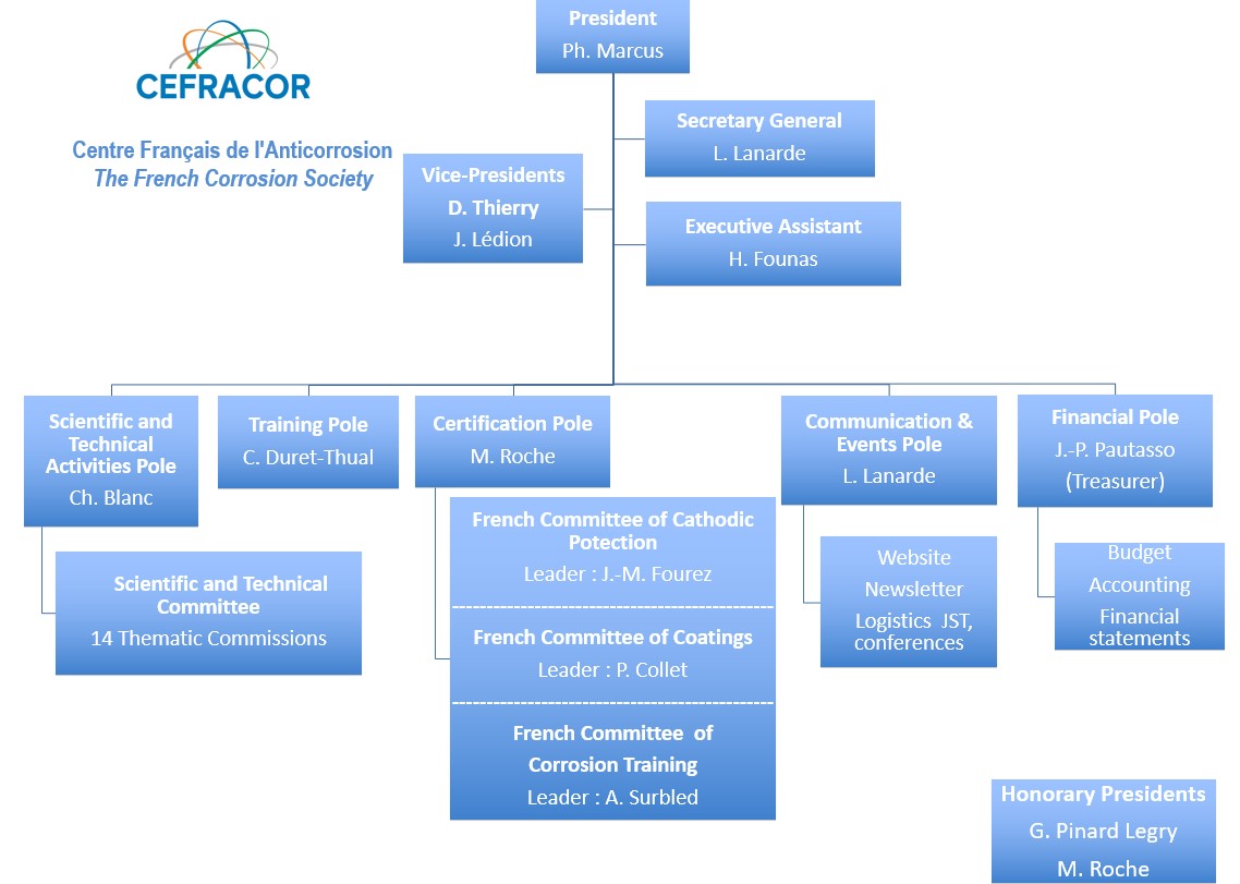 CEFRACOR is under the responsibility of a board of directors. Its administration is maintained by an office comprising the President, the Vice-Presidents, the Secretary General, the Treasurer, the President of the Scientific and Technical Committee, and the Honorary Presidents. The different activities of CEFRACOR are divided between the poles supervised by their directors.