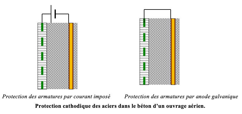 La protection cathodique s’applique aux zones où les armatures sont dépassivées, c’est-à-dire corrodées, généralement suite à la diffusion d’ions chlorures accompagnée éventuellement d’une chute du pH normalement très alcalin. Les anodes sont plaquées sur le béton dans ces zones. Il s’agit soit d’anodes galvaniques, soit d’anodes pour une protection par courant imposé.