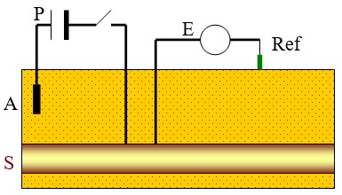 (S) structure enterrée, (A) : anode, (P) : alimentation, (Ref) : électrode de référence, E : millivoltmètre.