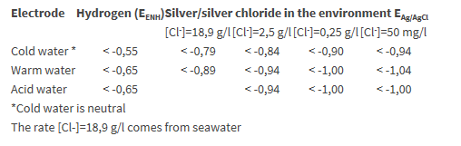 La valeur du potentiel à atteindre dépend du matériau constitutif de la structure et du liquide qu’il contient. Elle dépend aussi du type d’électrode de référence. Le tableau 4 donne l’exemple d’une structure en acier non allié contenant de l’eau.