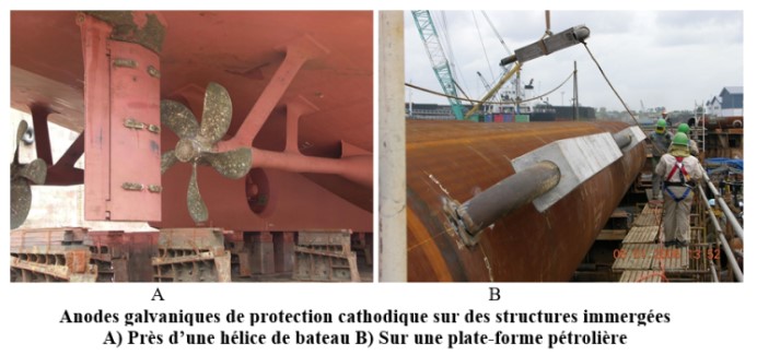 Les ouvrages métalliques immergés concernés par la protection cathodique sont mobiles (bateaux, tankers, plates-formes mobiles, portes d’écluse, etc.) ou fixes (ouvrages portuaires, plates-formes et installations sous-marines offshore, balises, canalisations immergées, stockages flottants, etc.). Ils sont dans l’eau de mer ou dans des eaux douces ou saumâtres. Ces ouvrages ont pratiquement tous un revêtement de protection, à l’exception des plates-formes fixes.